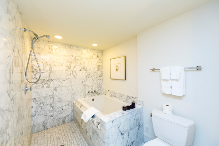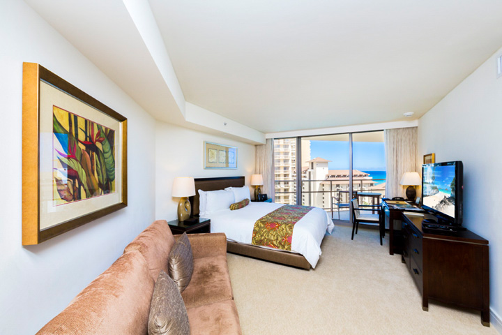 広さのあるワンルームには、ホテルのお部屋としては珍しくフル装備のキッチンがついています。白を基調にした明るい室内からは青い海と空を眺めることができ、また日本人には嬉しいバスタブ付きのゆったりしたバスルームがついています。高級感ある家具はもちろん、床材にはマーブルを使い、トランプならではのワンランク上のラグジュアリーな雰囲気を醸し出しています。